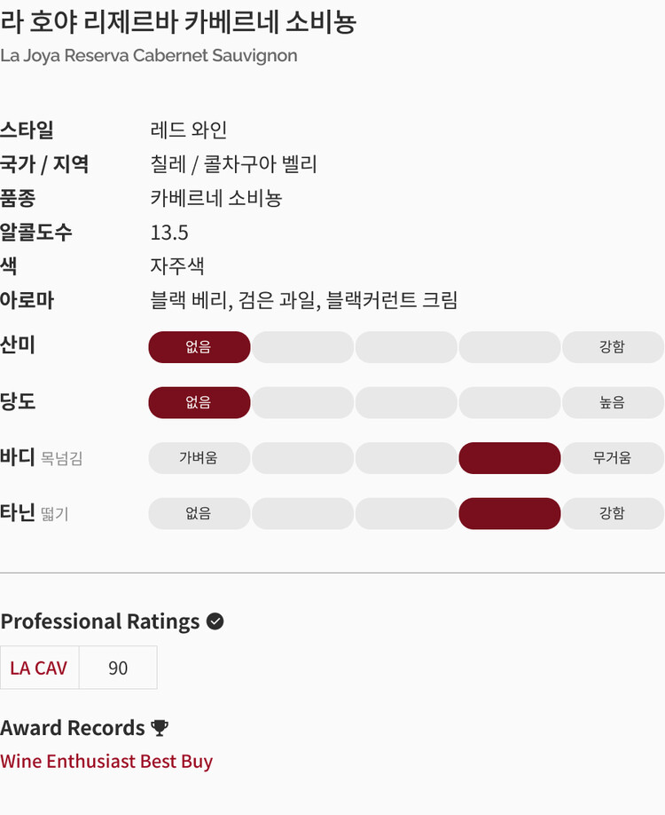 Nose : 잘 익은 검은 과실류, 자두, 향긋한 페퍼 향