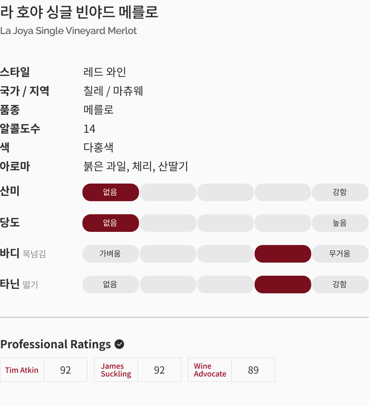 Nose : 블랙 베리, 자두, 카시스, 바닐라와 오크의 토스티함이 더해져 복합적이고 고급스러운 향