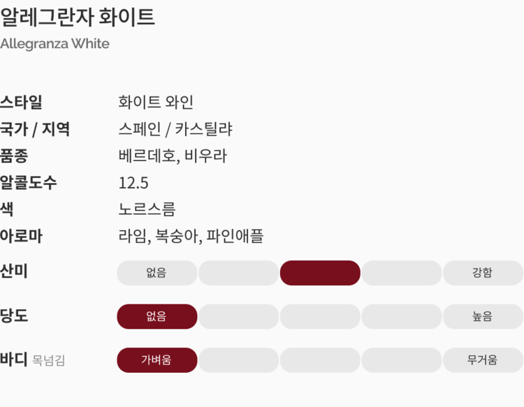 Mouth : 달콤한 장미꽃, 그레이프프룻과 파인애플 등의 과일 맛에 신선한 잔디향과 산도가 더해져 산뜻하고기분 좋은 끝맛을 만든다.