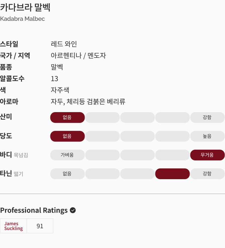 • 안데스산맥 해발 1,100m 고지에서 강렬한 햇빛과 차가운 공기를 맞고 자란 포도로 만들어 탄탄한 맛과 향이 특징이다.