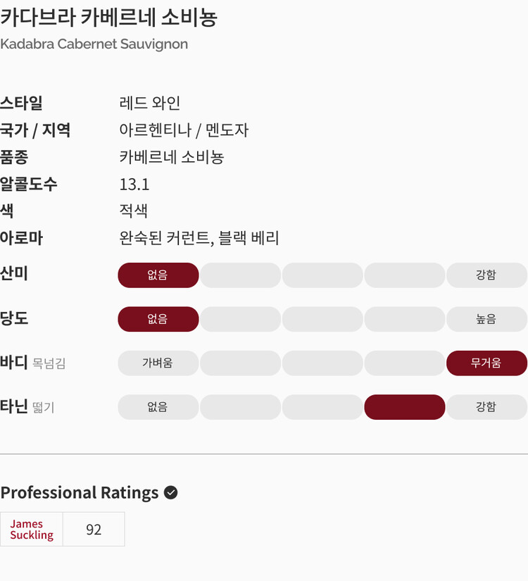 Nose : 완숙된 커런트, 블랙 베리의 섬세한 아로마, 향긋한 향신료의 캐릭터