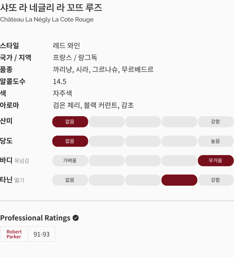 • 랑그독 지역의 최고급 와인이자 로버트 파커로부터 100점을 받은 와인을 생산하는 도메인으로 매년 최고의 점수를 받으며 명성을 쌓은 La Négly의 대중적인 와인