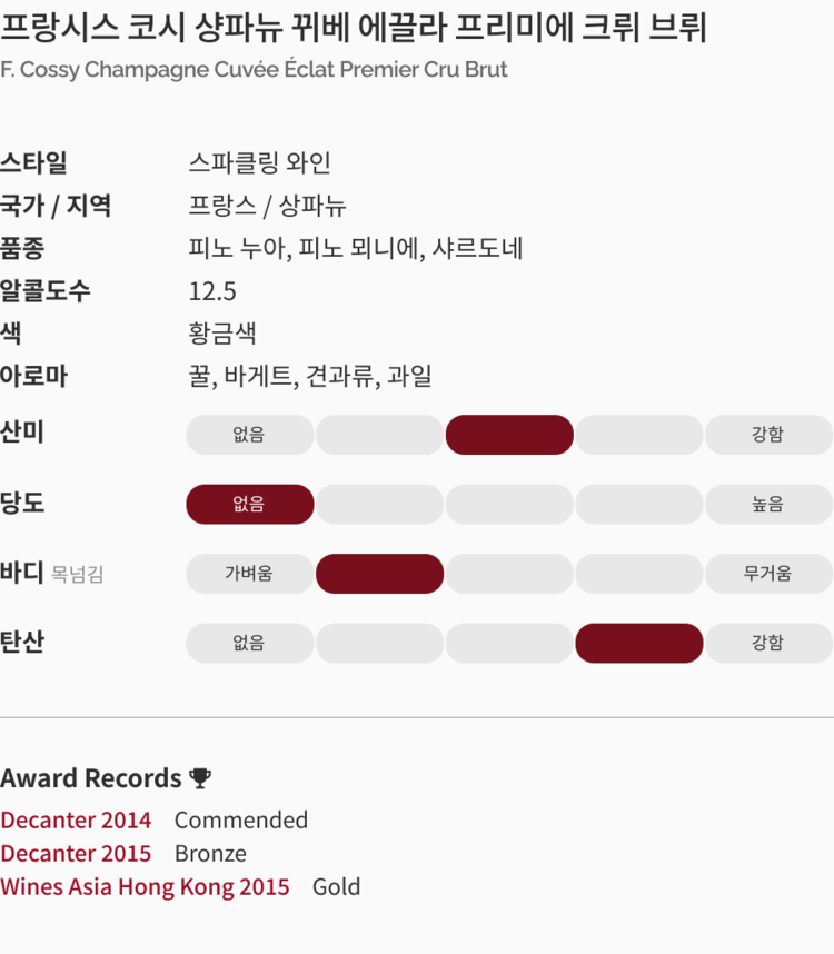 흰색 과일류의 섬세하고 복합적인 맛이 생동감 있게 느껴지며 신선한 미네랄 향과 좋은 밸런스를 이루며 산미가 풍성하게 터지는 부드럽고 라운드 한 샴페인이다.