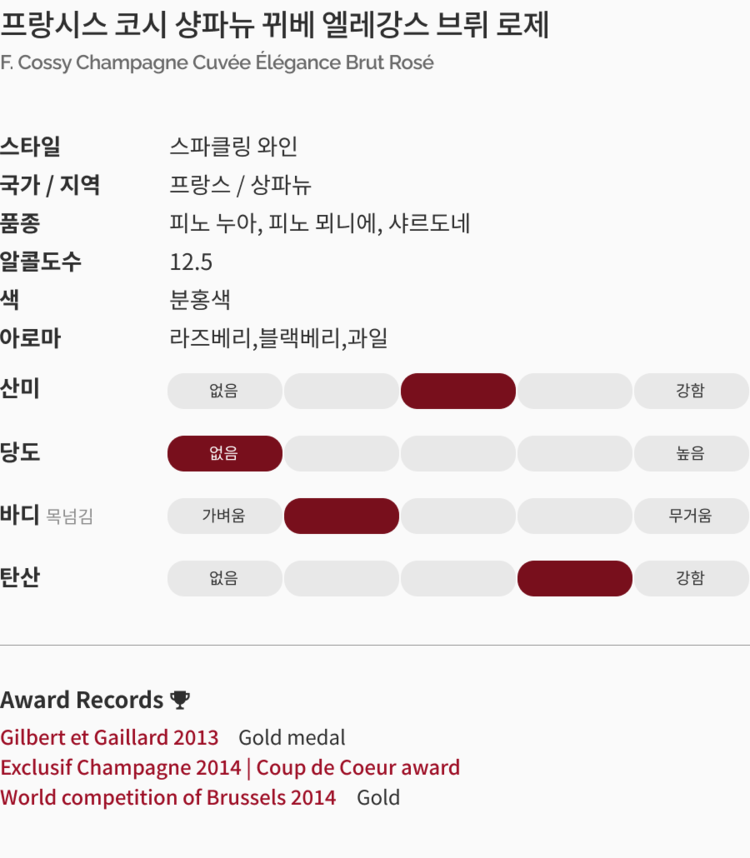 밝은 분홍색을 띠며 라즈베리, 블랙베리 등의 상큼한 과일향, 미네랄 향이 복합적으로 느껴지며 신선함과 고급스러움을 동시에 맛볼 수 있는 샴페인이다.