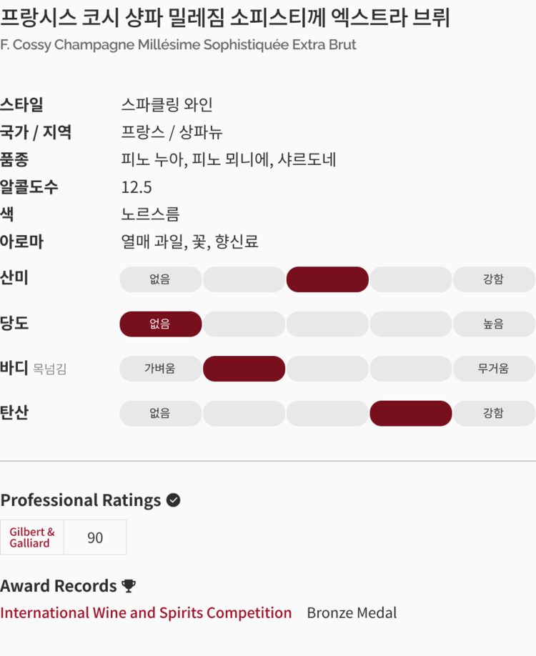 Dosage 과정을 통해 산도와 당도의 훌륭한 밸런스를 얻었으며, 실키한 질감에 신선함이 녹아든 촘촘한 구조감을 느낄 수 있는 와인이다.