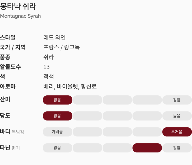 Aroma : 다양한 베리, 바이올렛, 페퍼와 향긋한 향신료의 향이 느껴진다.