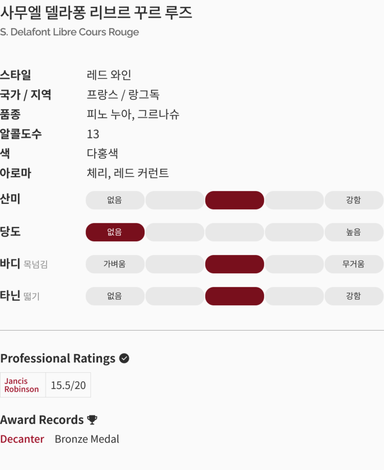 Nose : 체리, 레드 커런트 등의 붉은 과실류와 페퍼 등의 향신료의 향