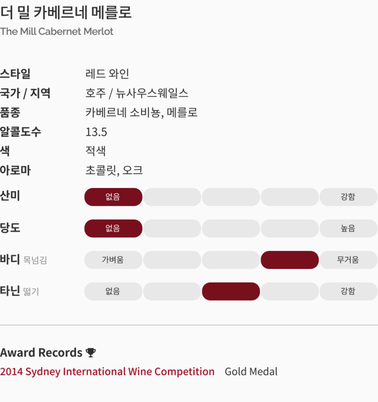 Mouth: 입안 가득 퍼지는 부드러운 첫인상과 함께 묵직한 붉은 과실류의 맛이 느껴지며 복합적인 오크의 풍미가 잘 짜여진 구조감과 피니쉬 를 만든다.