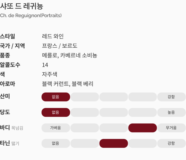 짙은 루비 & 가넷 톤의 색상을 띄며 풍부하고 신선한 블랙 커런트, 블랙베리 등의 과일향이 특징이다. 잘 익은 베리의 향이 깊은 맛을 만들며 스파이시한 향과 촘촘한 타닌이 더해져 긴 여운을 남긴다.
