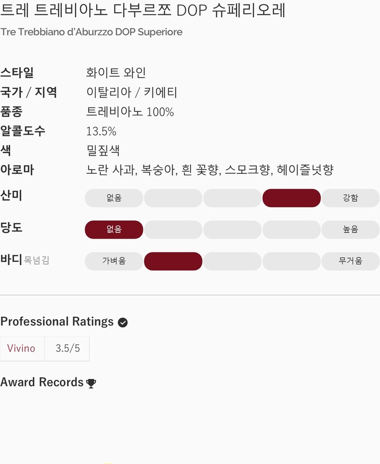 Nose : 노란 사과, 복숭아, 시트러스와 흰꽃향, 우아한 스모크향과 헤이즐넛 노트